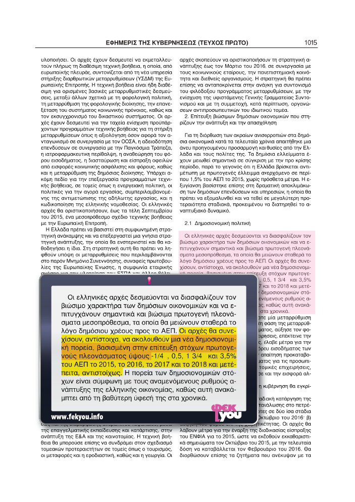 Στο νόμο 4336 του 2015 (μνημόνιο 3) που δημοσιεύτηκε στις 14 Αυγούστου 2015, η κυβέρνηση δεσμεύτηκε σε συμφωνημένους με τους δανειστές δημοσιονομικούς στόχους, με βασικό τη μείωση του δημοσίου χρέους ως ποσοστό του ΑΕΠ μέσω της επίτευξης πρωτογενών πλεονασμάτων για τα έτη 2015 – 2018 και μετά.