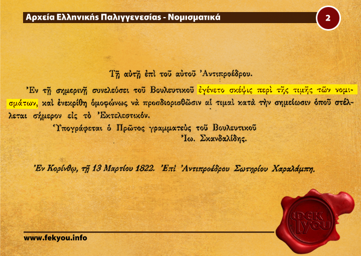 Συνεχίζοντας με τη σειρά νομισματικά (αριθμός 2), δημοσιεύουμε κείμενο από τα πρακτικά του Βουλευτικού που υπογράφεται από τον Ιω. Σκανδαλίδη επί αντιπροεδρίας Σωτηρίου Χαραλάμπη με ημερομηνία 13 Μαρτίου 1822, δηλαδή σχεδόν ένα χρόνο μετά την έναρξη του Αγώνα το 1821. Αφορά χρονικά την Α΄Βουλευτική Περίοδο (1822-1823). Πρόκειται για ένα από τα πρώτα χρονικά έγγραφα από τα Αρχεία της Ελληνικής Παλιγγενεσίας [1] που αναφέρεται στο ζήτημα της διατίμησης των νομισμάτων.