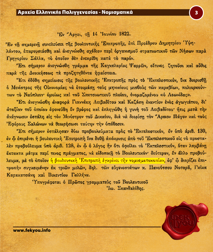 Συνεχίζοντας με τη σειρά νομισματικά (αριθμός 3) από τον πρώτο τόμο των Αρχείων της Ελληνικής Παλεγγενεσίας [1], δημοσιεύουμε κείμενο από τα πρακτικά του Βουλευτικού που υπογράφεται από τον Ιω. Σκανδαλίδη επί αντιπροεδρίας Σωτηρίου Χαραλάμπη με ημερομηνία 14 Ιουνίου 1822, δηλαδή δεκαπέντε μήνες μετά την έναρξη του Αγώνα το 1821. Αφορά χρονικά την Α΄Βουλευτική Περίοδο (1822-1823). Στο έγγραφο αναφέρονται διάφορα θέματα μεταξύ των οποίων εστιάζουμε εν προκειμένω στην έγκριση της Bουλευτικής επιτροπής για τη νομισματοκοπία και το σύσταση αρμόδιας τριμελούς επιτροπής για το ζήτημα αυτό, αποτελούμενη εκ των Πανούτσου Νοταρά, Γκίκα Καρακατσάνη, Βικέντιου Γαλληνά. Όπως θα δούμε και σε επόμενες δημοσιεύσεις τα ζητήματα περί νομισματοκοπίας, δημιουργίας νομισματοκοπείου και αργότερα και εγκαθύδρισης νέου νομισματικού συστήματος απασχολούσε τους επαναστατημένους έλληνες από τα πρώτα χρόνια της Επανάστασης. Χωρίς όμως τελικά να υλοποιηθούν τα σχέδια αυτά μέχρι την άφιξη του Καποδίστρια [2].
