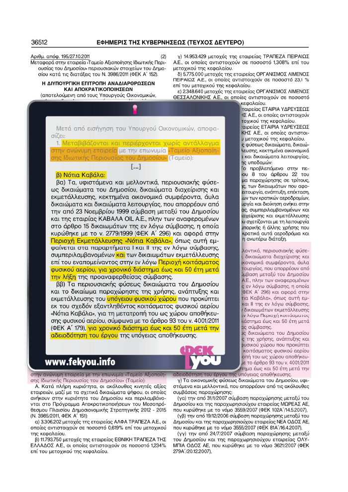 Το συγκεκριμένο ΦΕΚ [10] αναφέρεται σε μία σειρά δικαιωμάτων του Δημοσίου επί του φυσικού αερίου στην περιοχή της Νότιας Καβάλας που παραχωρήθηκαν ήδη από το 2011. Σημείο αναφοράς στη μεταβίβαση είναι ο η σύμβαση που κυρώθηκε με το νόμο 2779/1999 [11] και τροποποιήθηκε με το νόμο 4296 που δημοσιεύτηκε στις 2 Οκτωβρίου 2014. Ειδικότερα η αναφορά στο ΦΕΚ έχει δύο σκέλη.