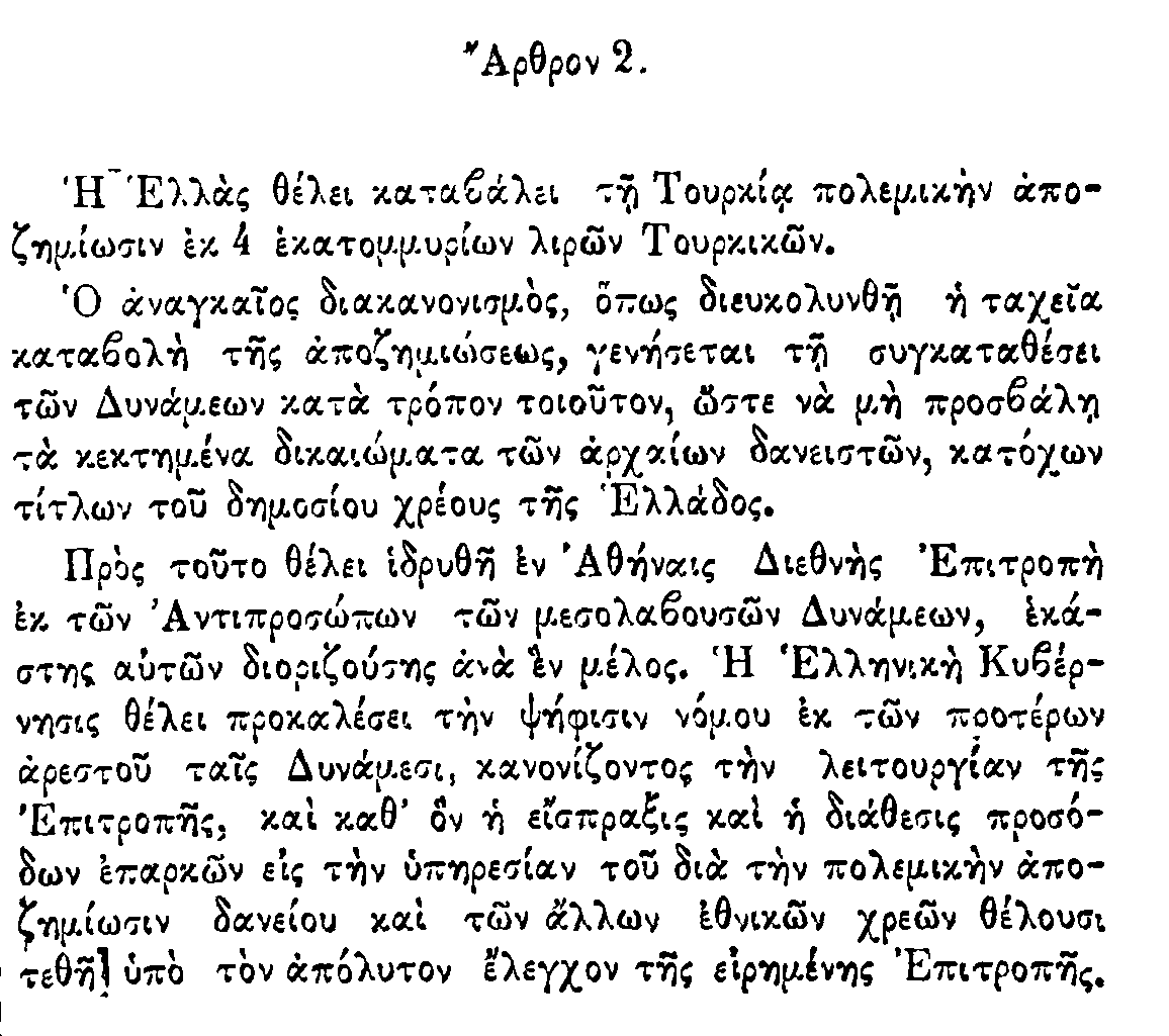 Στο άρθρο 2 των προκαταρκτικών όρων της συνθήκης ειρήνης μεταξύ Ελλάδας και Τουρκίας στις 6/18 Σεπτεμβρίου 1897 που αναφέρονταν στην πολεμική αποζημίωση προσθέτονταν ο όρος που βλέπουμε στη παρακάτω εικόνα [2]: