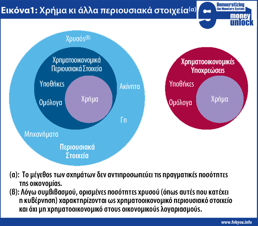 Υπάρχουν και μη χρηματοοικονομικά περιουσιακά στοιχεία όπως για παράδειγμα η γη και τα σπίτια, τα οποία δεν είναι απαιτήσεις προς οποιονδήποτε άλλο. Τα χρηματοοικονομικά περιουσιακά στοιχεία είναι απλώς απαιτήσεις επί κάποιου άλλου στην οικονομία – ένα IOU προς ένα πρόσωπο, μια εταιρεία, μια τράπεζα ή μια κυβέρνηση ή κατ’ άλλη έκφραση τα χρηματοοικονομικά περιουσιακά στοιχεία ενός ατόμου είναι πάντα το χρέος κάποιου άλλου.