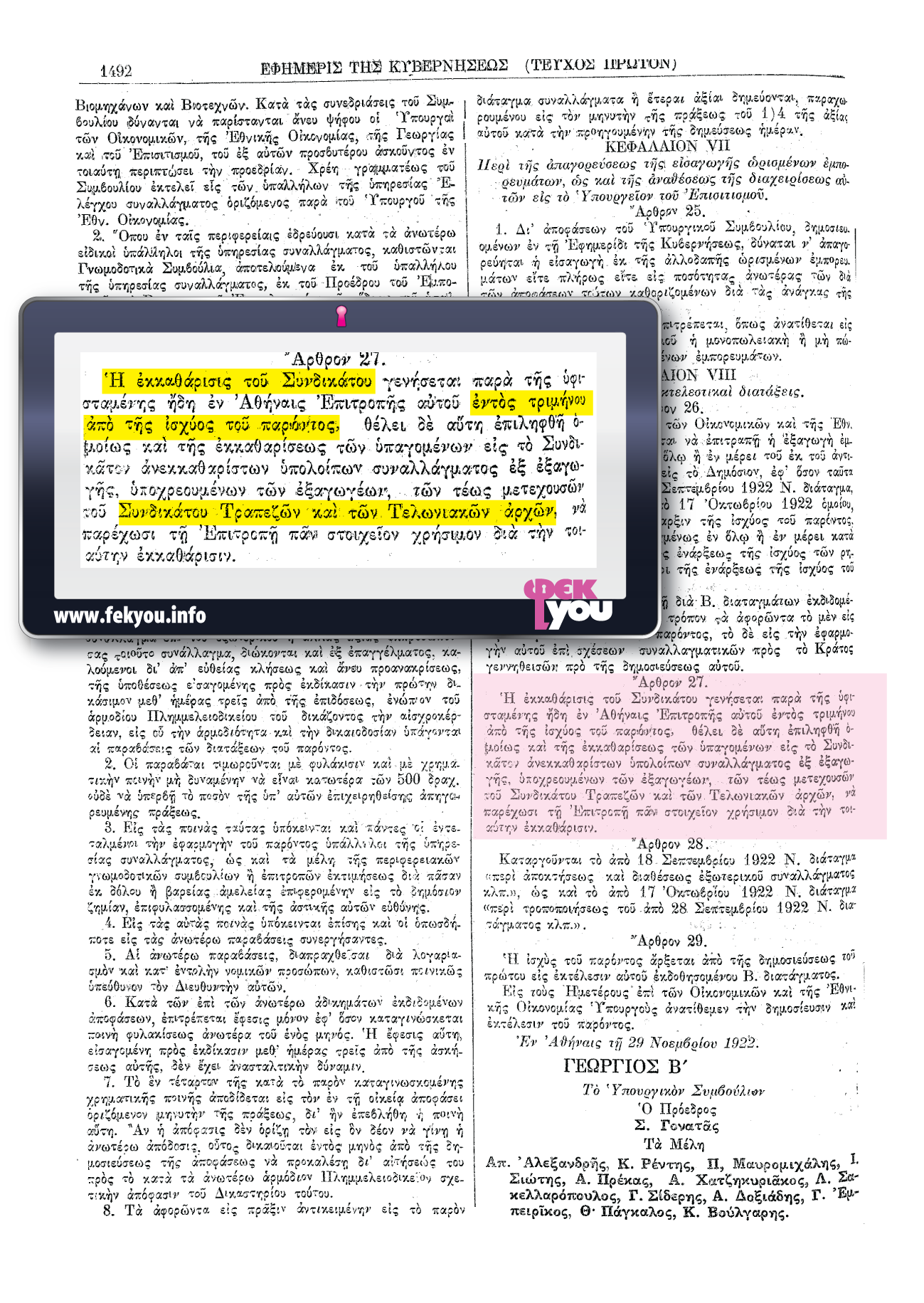 - 11 Βλ. π.χ. τα Βασιλικά Διατάγματα της 15/6/1921 (ΦΕΚ 106Α, 18/6/1921, σ. 435-436) και της 8/7/1921 (ΦΕΚ 123Α, 15/7/1921, σ. 513-514).