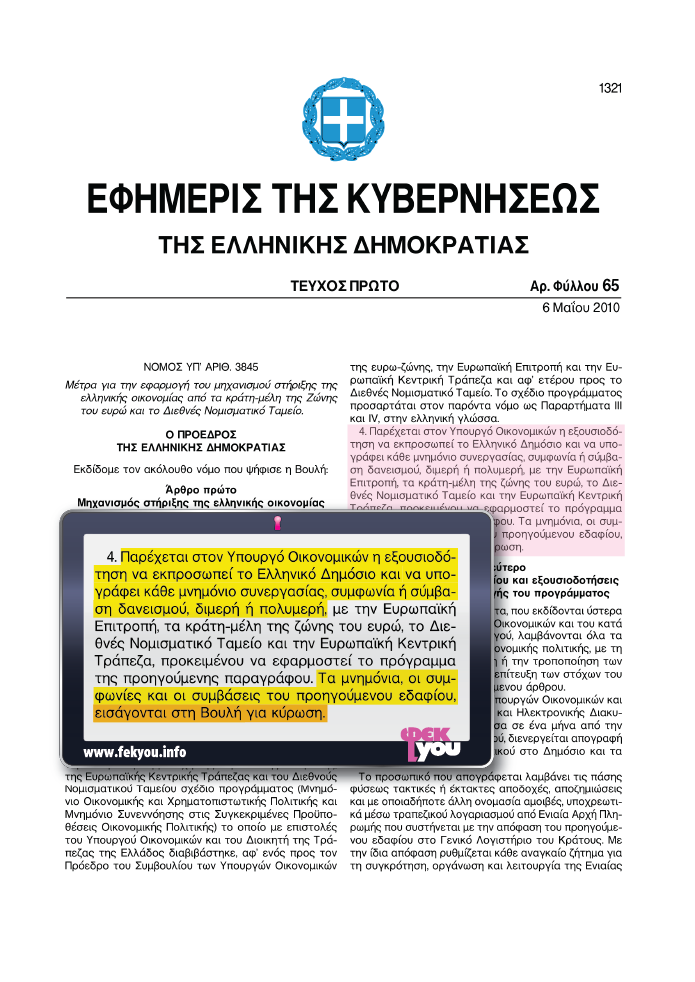 Στις 6 Μαΐου 2010 δημοσιεύτηκε ο νόμος 3845/2010 (το λεγόμενο μνημόνιο 1). Στην εισαγωγή του νόμου αυτού και συγκεκριμένα στο άρθρο 1 παράγραφος 4 προβλέπονταν η εξουσιοδότηση στον Υπουργό οικονομικών να εκπροσωπεί το Ελληνικό Δημόσιο και να υπογράφει κάθε μνημόνιο συνεργασίας, συμφωνία ή δανειακή σύμβαση (διμερή ή πολυμερή) με την Ευρωπαϊκή Επιτροπή και τα κράτη-μέλη της ζώνης του ευρώ, με το ΔΝΤ και την ΕΚΤ. Έπειτα απαιτούνταν, σύμφωνα με την παραπάνω διάταξη (άρθρο) να εισάγονται στη Βουλή για κύρωση, δηλαδή να επικυρώνονται με ψηφοφορία στο ελληνικό κοινοβούλιο.