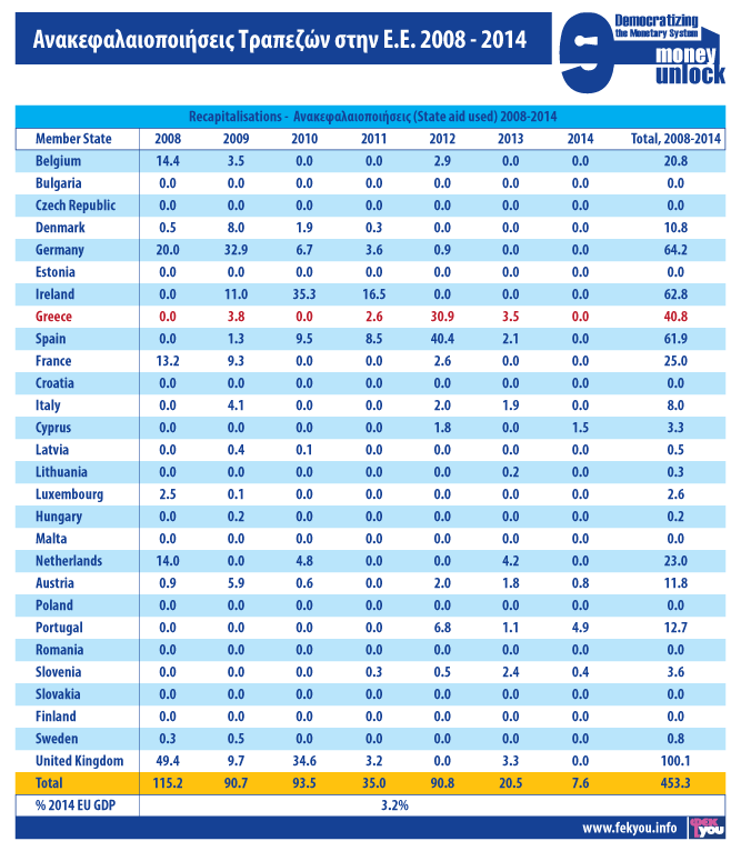 Στην Ελλάδα (με κόκκινο χρώμα) την περίοδο 2008 – 2014 οι τράπεζες ανακεφαλαιοποιήθηκαν με περίπου 41 δισεκατομμύρια ευρώ. Η χώρα με τα μεγαλύτερα ποσά ανακεφαλαιοποιήσεων για τις τράπεζες είναι η Αγγλία με 100 δισεκατομμύρια ευρώ. Το συνολικό ποσό εγκεκριμένων ανακεφαλαιοποιήσεων από τα κράτη μέλη της Ε.Ε. προς τις τράπεζες έφτασε τα 453 δισεκατομμύρια ευρώ (ή 3.2% του ΑΕΠ της Ευρωπαϊκής Ένωσης).