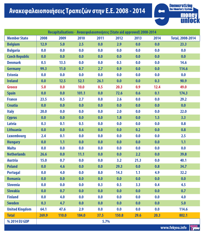Στην Ελλάδα οι ελληνικές κυβερνήσεις (με κόκκινο χρώμα) την περίοδο 2008-2014 είχαν εγκρίνει 49 δισεκατομμύρια ευρώ. Η χώρα με τα εγκεκριμένα μεγαλύτερα ποσά ανακεφαλαιοποιήσεων είναι η Ισπανία με λίγο πάνω από τα 174 δισεκατομμύρια ευρώ και ακολουθεί η Γερμανία και η Αγγλία με 114,6 δισεκατομμύρια ευρώ. Το συνολικό ποσό εγκεκριμένων ανακεφαλαιοποιήσεων από τα κράτη μέλη της Ε.Ε. προς τις τράπεζες έφτασε τα 802 δισεκατομμύρια ευρώ (ή 5.7% του ΑΕΠ της Ευρωπαικής Ένωσης).