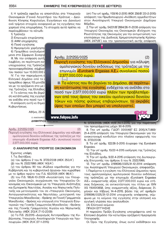 Το έκτο ΦΕΚ της κυβέρνησης ΣΥΡΙΖΑ που αφορά ποσά παροχής εγγυήσεων του Ελληνικού Δημοσίου προς τις τράπεζες. Η δωδέκατη απόφαση (από τις 30 συνολικά) αφορά την παροχή εγγύησης για κάλυψη ομολογιακού δανείου εκδόσεως της τράπεζας με την επωνυμία «Eurobank Ergasias Α.Ε.» συνολικού ποσού 2.377.000.000 ευρώ, με την υπογραφή του τότε υφυπουργού οικονομικών (ΥΑ).