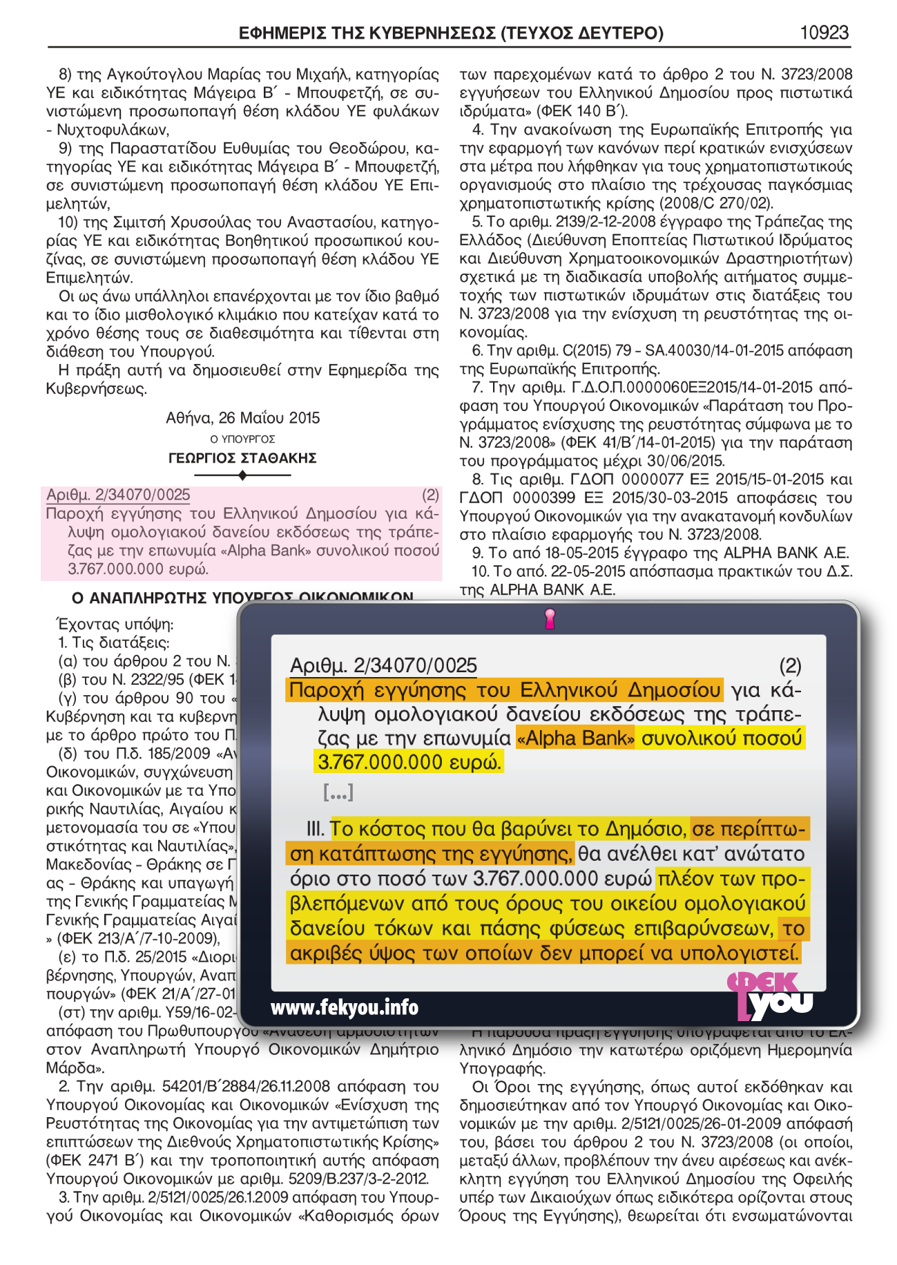 Το ένατο ΦΕΚ της κυβέρνησης ΣΥΡΙΖΑ που αφορά ποσά παροχής εγγυήσεων του Ελληνικού Δημοσίου προς τις τράπεζες. Η δέκατη όγδοη απόφαση (από τις 30 συνολικά) αφορά την παροχή εγγύησης για κάλυψη ομολογιακού δανείου εκδόσεως της τράπεζας με την επωνυμία «Alpha Bank Α.Ε.» για συνολικό ποσό 3.767.000.000 ευρώ, με την υπογραφή του τότε υφυπουργού οικονομικών (ΥΑ).